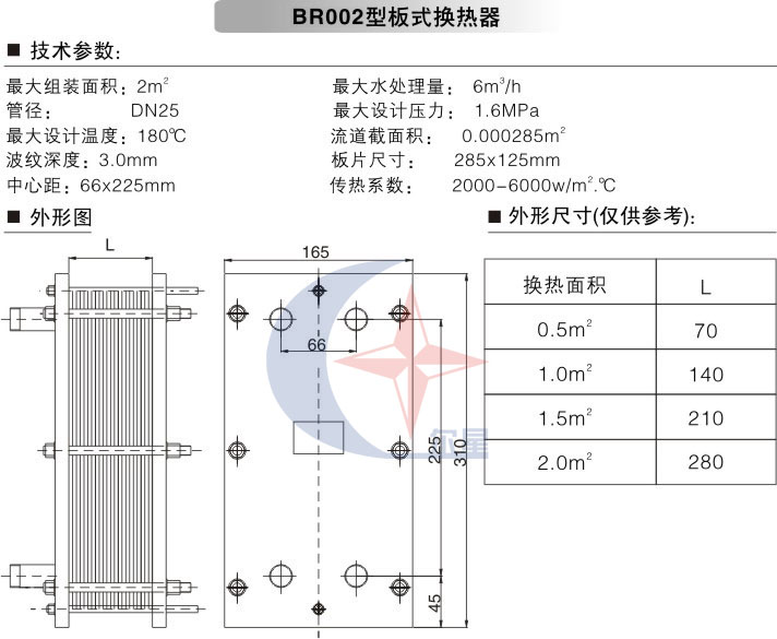 | 板片材質(zhì): 不銹鋼材質(zhì):SUS304、321、316、316L、純鈦TAI-A 密封墊片: 丁晴膠(NBR) (使用溫度:-20-+120℃)三元乙丙膠(EPDM) (使用溫度:-50-+150℃)氟膠(Viton) (使用溫度:-0-+180℃) 板片厚度: 0.5mm |