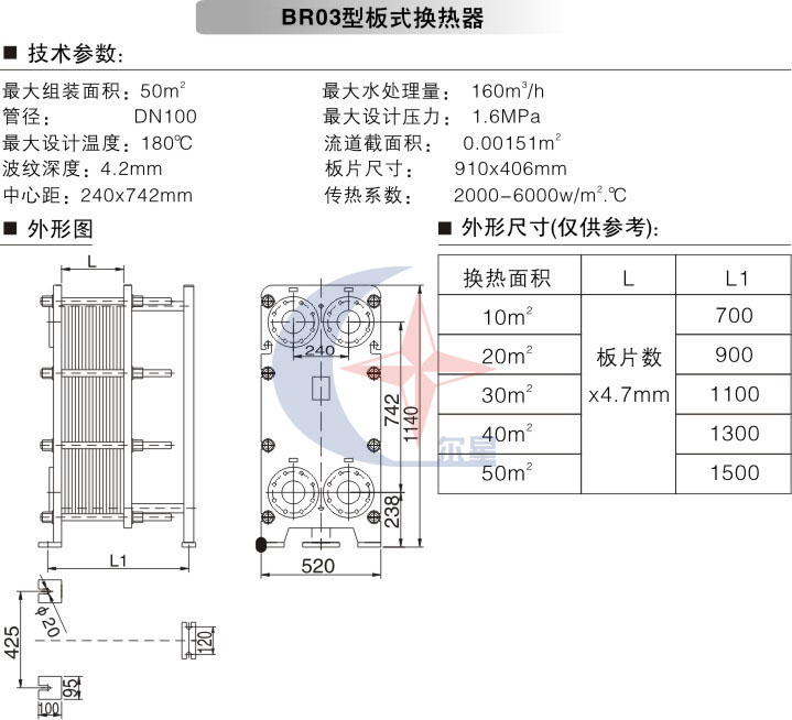 BR03型板式換熱器是一種新型的節(jié)能熱交換裝置,具有傳熱效果高、結構緊湊、占地面積小、 操作簡便,清洗、拆卸、維護方便,容易改變換熱面積或流程組合等優(yōu)點。